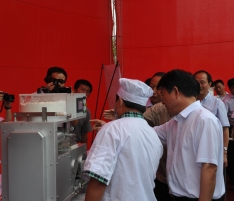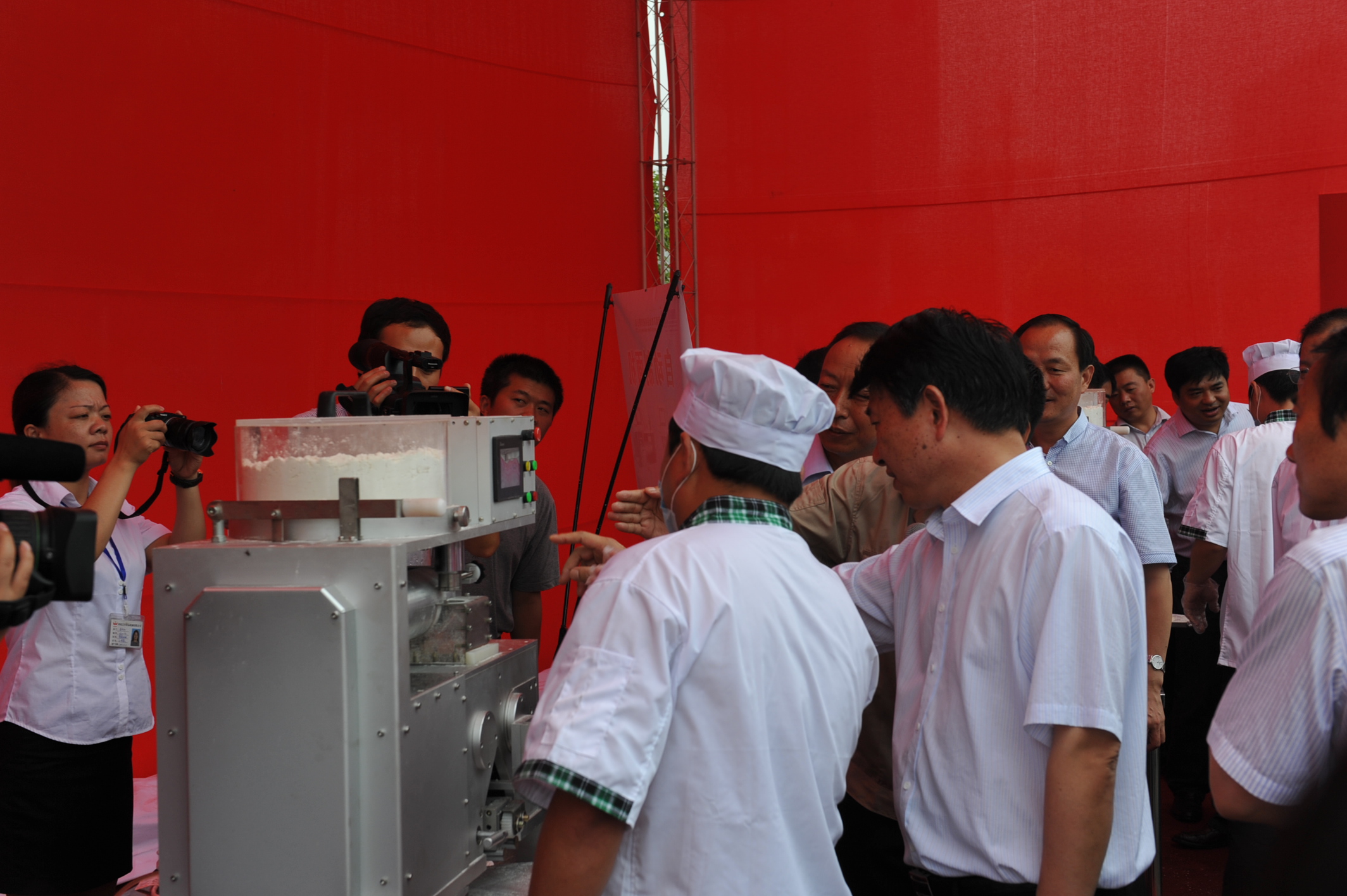 惠民工程與產(chǎn)品創(chuàng)新成觀摩新亮點,市委書記王樹山鼓勵董事長王曉杰放眼于未來,著眼于當下,務必把各項工作做精、做細、做扎實! 本報訊(仝利坡) 7月21日,市委書記王樹山、市長張國暉攜百人觀摩團到我司觀摩,襄城縣縣委書記蘇建濤、縣長何天立陪同觀摩。 襄城縣發(fā)改委辦公室主任向觀摩團一行報告我司發(fā)展歷程、產(chǎn)品結(jié)構(gòu)、建設(shè)項目、市場前景、社會效益和利稅狀況。 公司董事長王曉杰向市委、市政府觀摩團著重介紹公司戰(zhàn)略產(chǎn)品。在全自動制面機展示區(qū),董事長王曉杰向觀摩團介紹:全自動制面機以快速成型,從和面、壓片、成型一次完成僅需10秒鐘之內(nèi)即可做出口感不輸傳統(tǒng)工藝的面條,制面效率提升百倍以上;根據(jù)食量不同,設(shè)置單份面條分量和連續(xù)出面條的份數(shù),通過份數(shù)的設(shè)置可實現(xiàn)1-999份的任意數(shù)值的連續(xù)作業(yè);可任意通過更換面刀而實現(xiàn)白面、雜面、蔬菜面、蘭州拉面、烏冬面、刀削面等多種面條的制作。未來計劃進入商超、部隊、社區(qū)、學校,為人民群眾提供快捷、健康的主食供應服務。 具有科研背景的市委書記王樹山聽完董事長王曉杰的解說后對全自動制面制興趣濃厚,隨手拿到一元硬幣,親自通過投幣體驗全自動制面機的操作,市長張國暉也在工作人員的介紹下操作PLC控制系統(tǒng)體驗全自動鮮食面加工過程。 董事長王曉杰在包子機展示區(qū)介紹說:包子機在2011年12月通過省級科技成果鑒定,2012年5月獲得許昌市科技進步一等獎。包子機采用